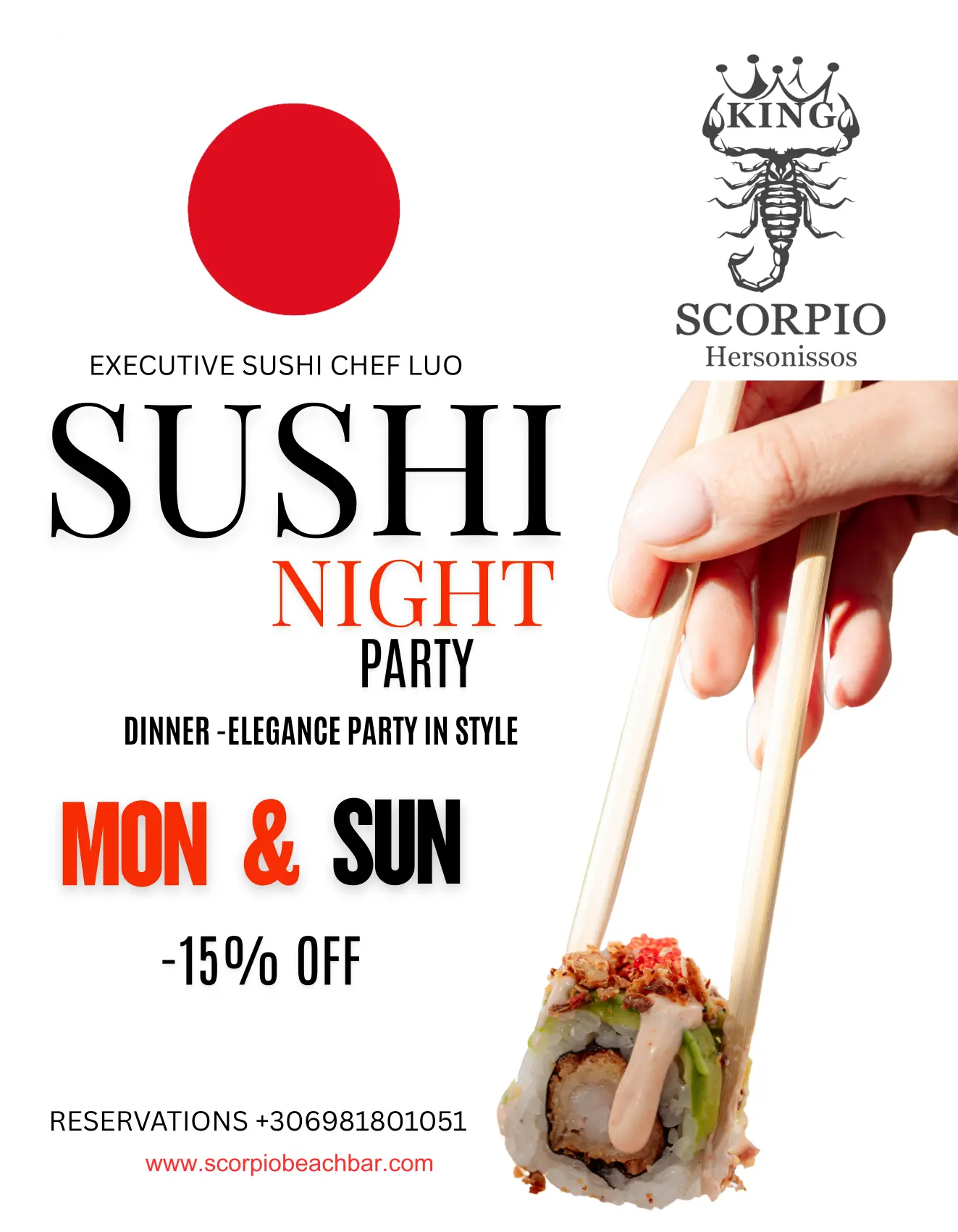 At King Scorpio, our Sushi Bar invites you on a journey of refined flavors where tradition meets creativity. Our chefs craft each roll with the finest ingredients, combining the freshness of the sea with delicate artistry on every plate. From classic sashimi and nigiri to signature fusion rolls, every bite is designed to surprise and delight your senses. Pair your sushi with a premium sake or a refreshing cocktail and enjoy an unforgettable dining experience by the sea.
